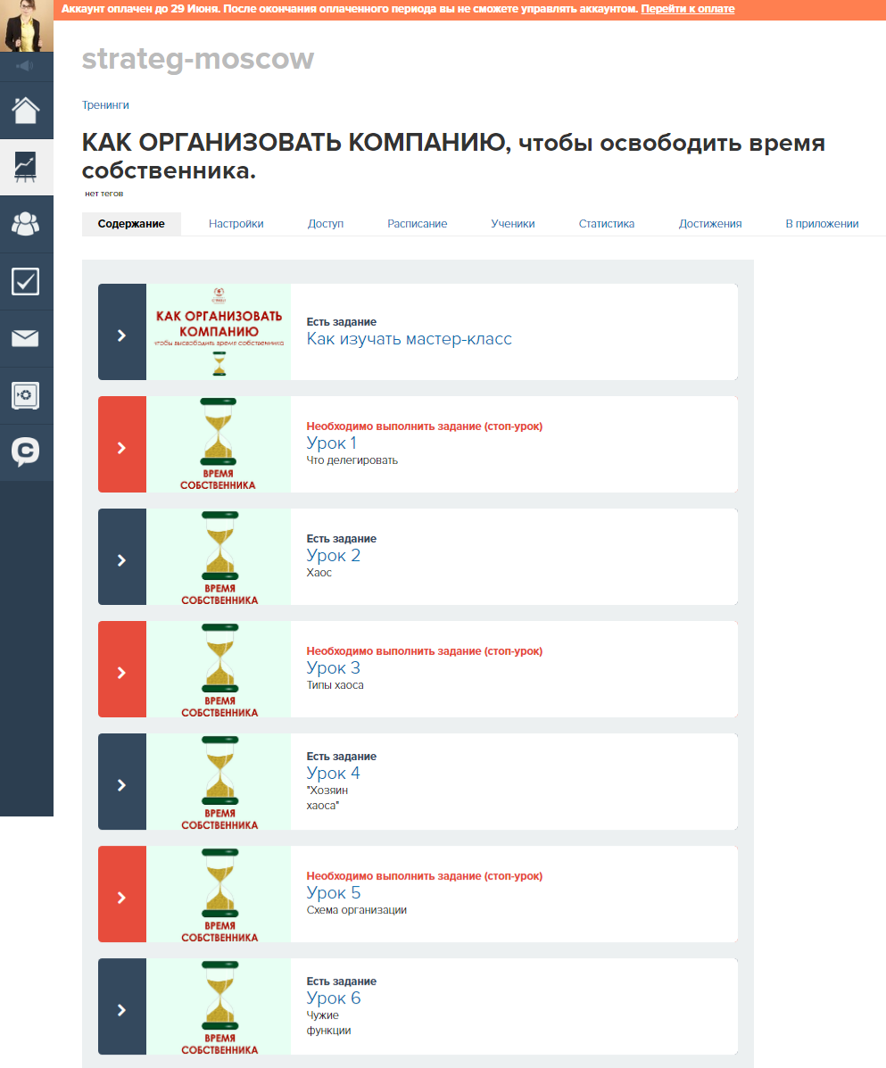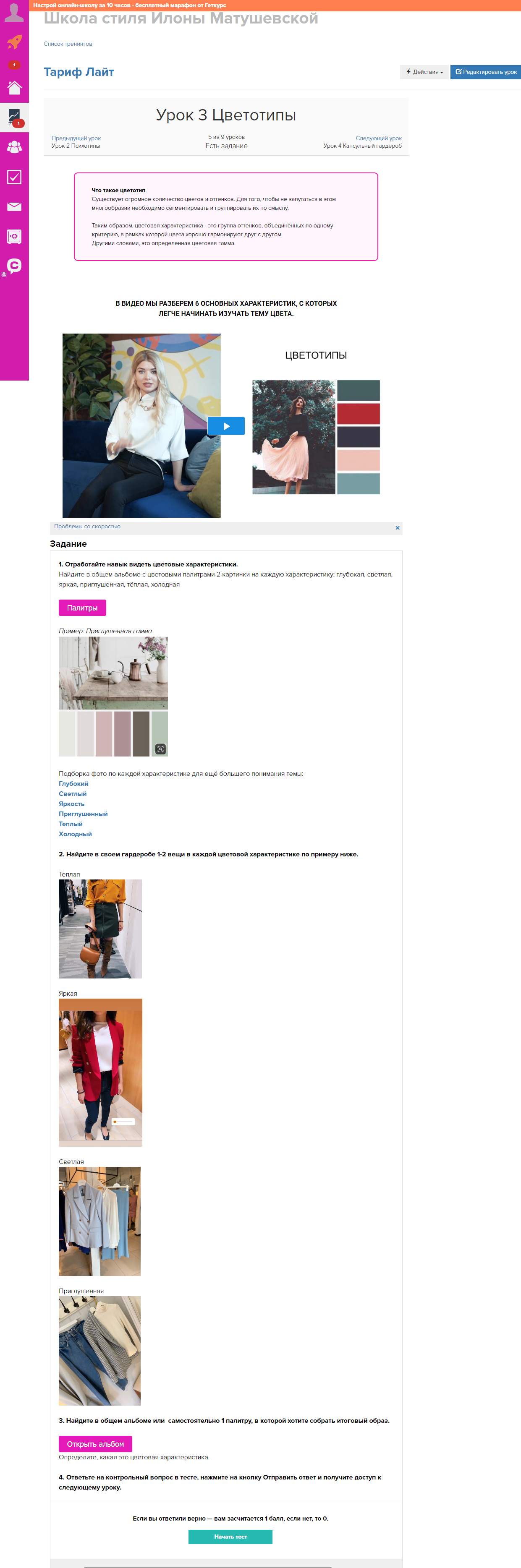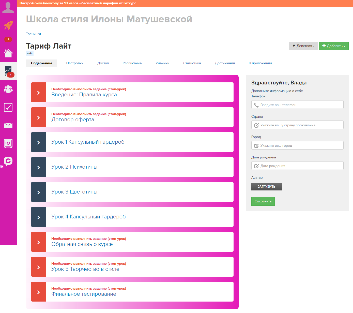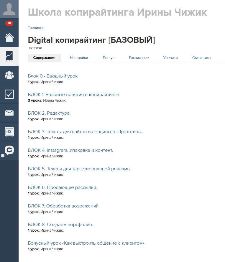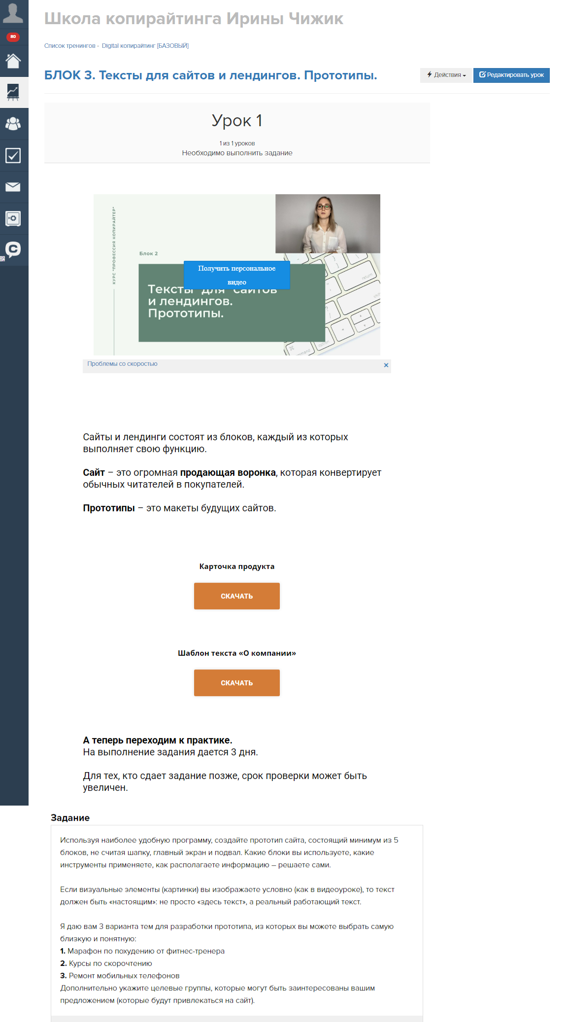 — перенос контента и оформление 1 тренинга (до 10 уроков);