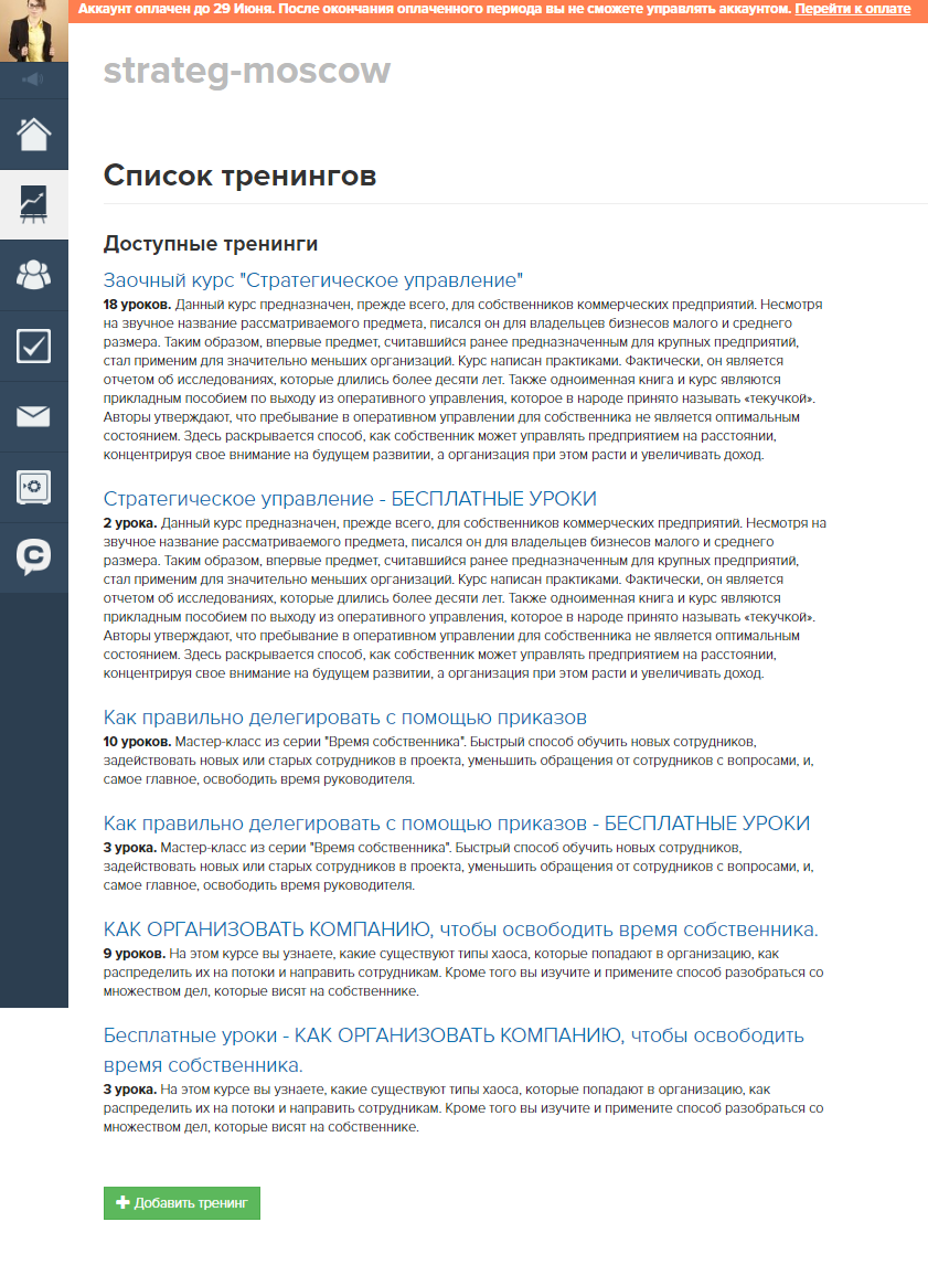 — создание и заливка до 2 тренингов (до 10 уроков);