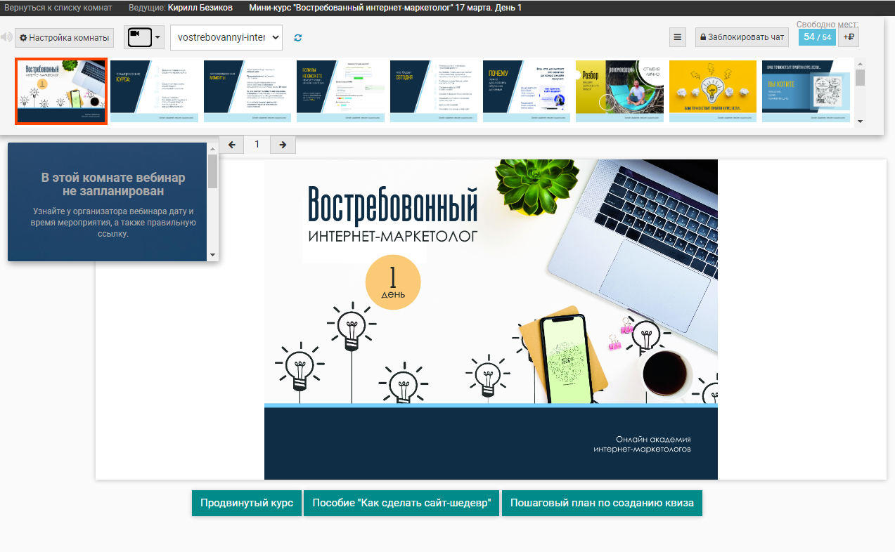 — подготовка кнопок и ссылок для участников по сценарию вебинара.