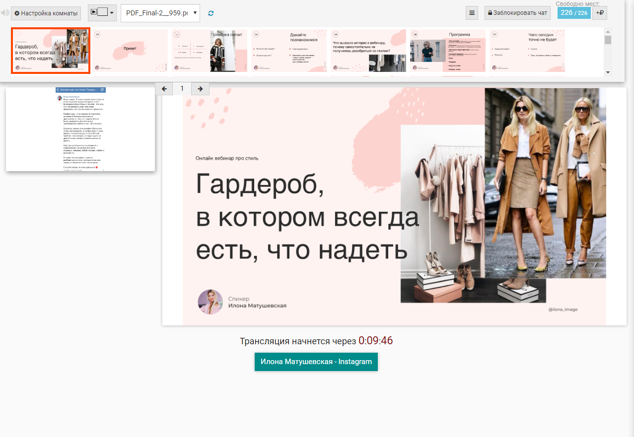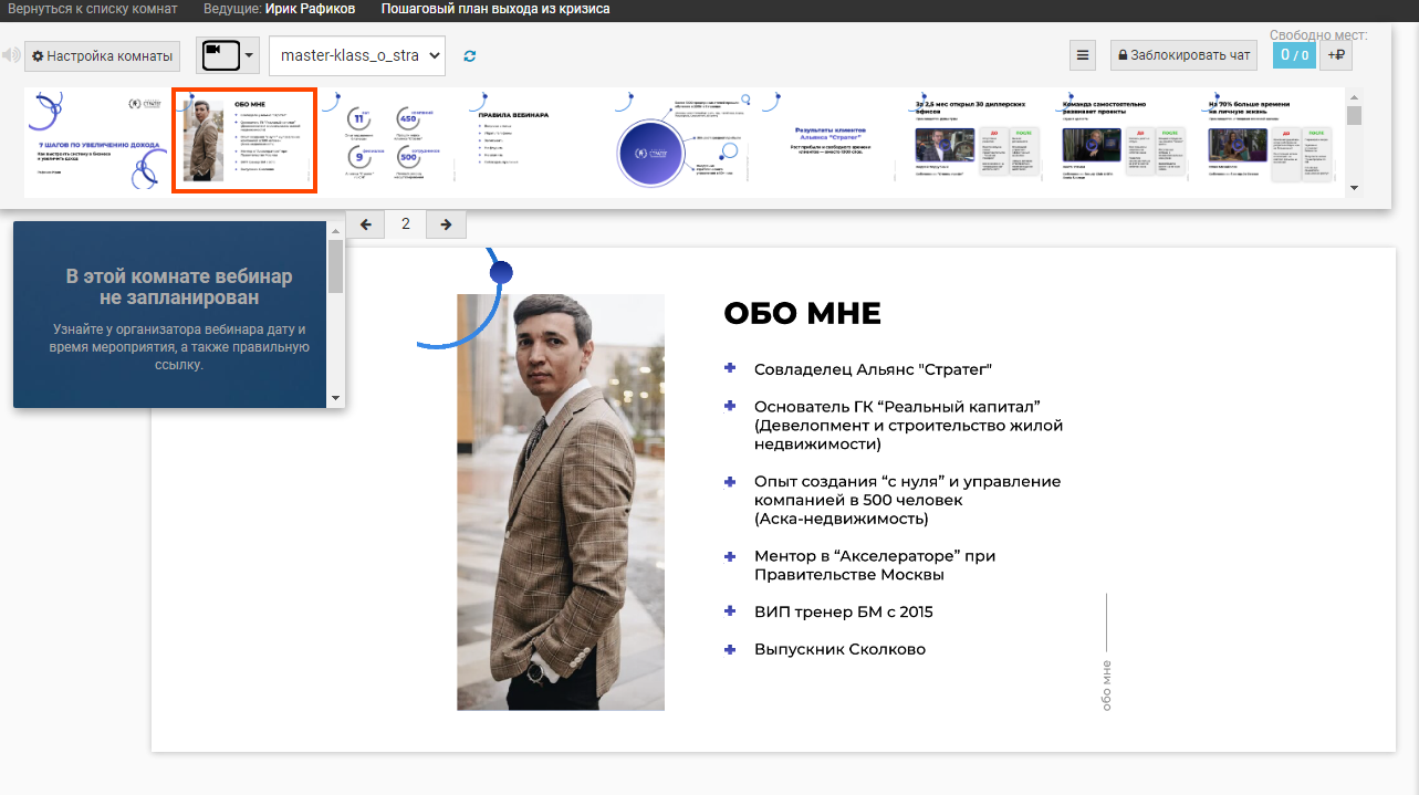 — подготовка вебинарной комнаты к эфиру: оформление, загрузка необходимого доэфирного и эфирного материала;